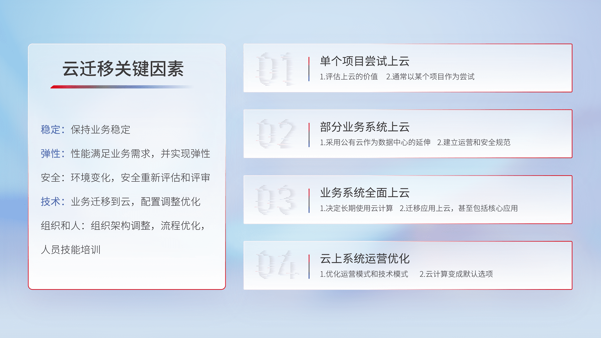 结合实际业务,,,从规划设计、、、云平台选型、、、、云原生改造、、数据迁移、、、集成交付,,,,迁移全过程为客户识别最佳上云路径,,做好风险识别管理,,,设计网络架构、、、身份权限、、、、安全审计合规、、操作审计、、、、日志审计、、监控告警策略、、、、多站点容灾设计等,,,,对云上基础设施进行整体规划,,,提升IT治理水平,,,以满足弹性、、高可用、、高性能的需求。。